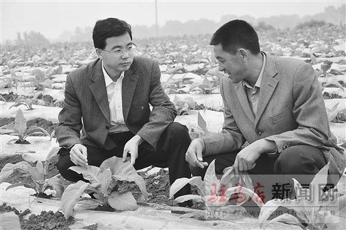 泌陽縣是全國有名的“金銅山優質煙葉”生產基地,今年種植煙葉5萬畝,為保證煙葉生產質量,全部實行了農業標準化種植。圖為該縣質監局負責同志深入田間指導煙葉標準化生產。記者 李國喜 攝