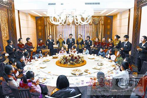 活動開始,工作人員首先帶領我們參觀了后廚。隨后,我們來到宴會廳,餐桌上整齊地擺放著各種餐具。好多餐具我以前都沒見過呢。我們爭搶著坐在桌前。在這里,我知道了主人、客人在餐桌座位的坐法、上菜的方法等。主陪(主人)要坐在對著門口的座位,主陪兩側坐主賓(客人)和副主賓,然后依次坐客人。主陪對面坐副主陪,副主陪兩側坐其他陪客。
