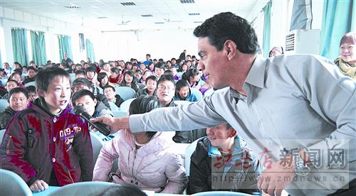 “hello,Wally!”講座一開始,小記者們用英語向外教問好。一走上講臺,Wally就以他傳統(tǒng)的美式幽默博得了大家的歡笑和掌聲。問答環(huán)節(jié)中,學(xué)生志愿者將小記者們提出的各種問題翻譯給外教。小記者的提問花樣百出,有人問外教喜不喜歡駐馬店,還有小記者想了解外教在中國的生活。平時怎么做飯,喜歡吃什么樣的水果。外教都一一做出精彩的回答,現(xiàn)場笑聲、掌聲不斷。