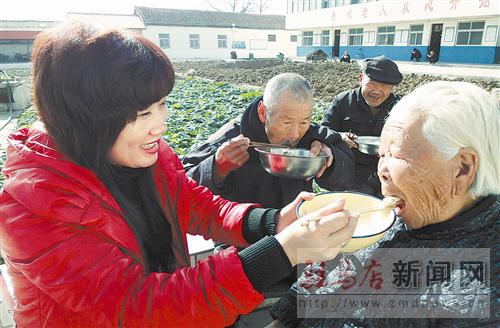 敬老院的工作人員喂行動不便的老人吃餃子。 記者 弓華靜 攝