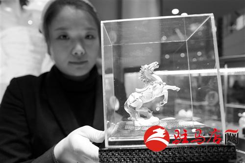 昨日,大商新瑪特駐馬店總店的營業員在展示黃金擺件“黃金馬”。隨著馬年的到來,商家推出了很多以馬為主題的黃金飾品來吸引廣大市民購買。 記者 吳 波 攝