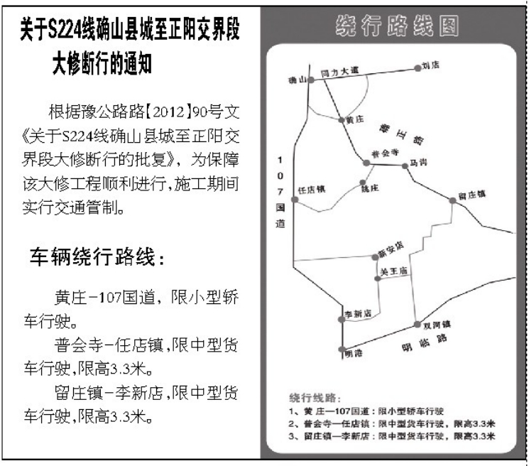 關于S224線確山縣城至正陽交界段大修斷行通知