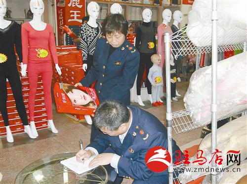 為加強流通領域商品質量監管力度,正陽縣工商局發揮監管職能,對市場上銷售的保暖內衣進行抽檢。圖為近日該局執法人員對一商店內銷售的保暖內衣進行抽檢。 記者 楊軍民 通訊員 李柏勇 攝影報道