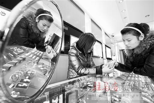 在山東臨沂市郯城縣一家金店,顧客在選購黃金飾品。世界黃金協(xié)會(huì)