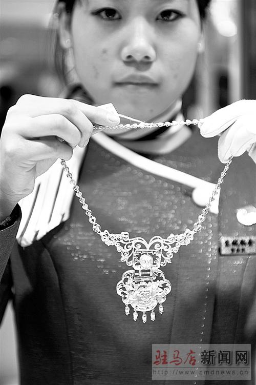 近日,在北京一家黃金飾品銷售店,銷售人員在展示一件黃金飾品。中國黃金協(xié)會