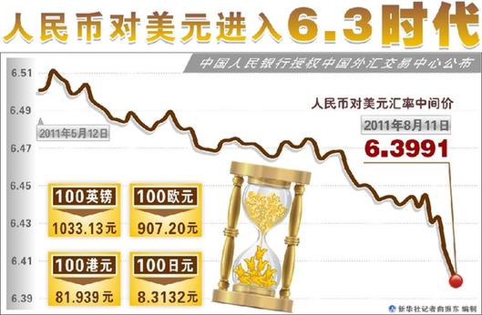 摘要: 人民幣匯率加速升值。11日人民幣對美元匯率中間價報6.3991,首次突破6.40整數關口,再創匯改以來新高。而單日漲幅亦擴大至176個基點,再度刷新9個月來的單日漲幅紀錄。 一些業內人士揣測,在海外金融市