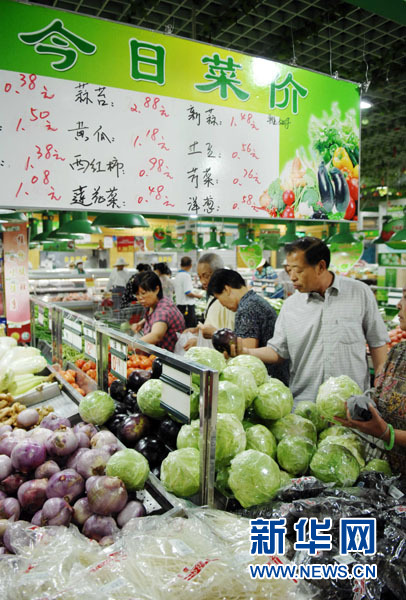 8月9日,市民在寧夏銀川一家超市內選購蔬菜。 當日,國家統計局發布數據,7月份我國CPI同比上漲6.5%,環比上漲0.5%。其中食品價格同比上漲14.8%,豬肉價格同比上漲56.7%。 新華社記者 彭昭之 攝