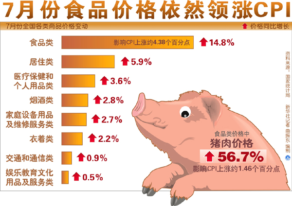 國家統計局9日發布數據顯示,7月份全國居民消費價格總水平(CPI)同比上漲6.5%,漲幅比上月的6.4%提高了0.1個百分點。物價的逐月走高,引起了廣泛關注和諸多議論。比較集中的有兩點:一點是物價上漲是否見頂?中國是否進入了高通脹時代?再一點,上漲最厲害的豬肉價格是不是導致物價總水平上升的“元兇”?豬肉價格上漲的背后究竟反映了哪些問題?這都需要深入進行剖析——