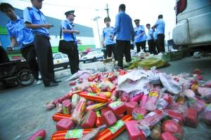 十多分鐘后,四五輛執法車分別從市場南門和該市場東側胡同開出,直接堵在銷售過期食品的攤位前。參與執法的除了大興區工商分局德茂工商所的十多名工作人員,還有屬地派出所的民警及城管。