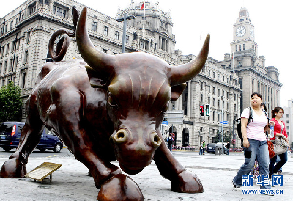 6月8日,行人從上海市黃浦區外灘“金融牛”雕塑前經過。新華社記者陳飛攝