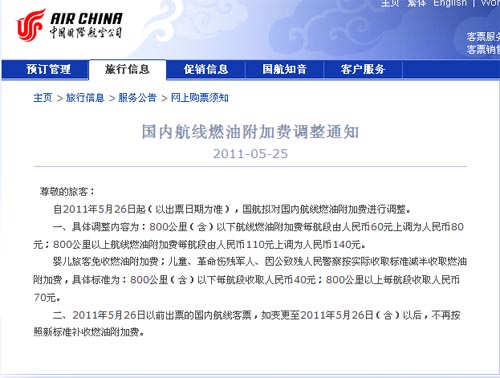 摘要: 圖片截自國航網(wǎng)站 四川航空公司今日發(fā)布消息稱,由于目前航空燃油綜合采購成本上調(diào),將在5月26日零時(shí)起上調(diào)國內(nèi)航線燃油附加費(fèi)。國內(nèi)航線燃油附加費(fèi)征收標(biāo)準(zhǔn)為800公里(含)以下航線,燃油附加由原來的60元調(diào)
