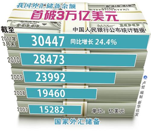 摘要: 中國外匯儲備首次突破3萬億大關,引來了一片驚嘆、擔憂之聲,握有巨額外匯資產之后應該怎么辦? 央行公布的數據顯示,截至3月末,國家外匯儲備余額為30447億美元,同比增長24.4%,外匯儲備