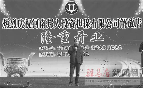 摘要: 4月11日上午,河南邦人投資擔保有限公司隆重開業(yè)。據(jù)了解,河南邦人投資擔保有限公司是一家經河南省工信廳批準、駐馬店市工商局注冊的專業(yè)投資擔保公司。公司設有理財部、風控部、財務部、綜合部等。