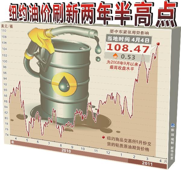 首先,近一段時間以來,受中東、北非特別是利比亞局勢動蕩影響,國際市場油價繼續(xù)大幅攀升。3月初,美國西德克薩斯原油和英國北海布倫特原油期貨價格分別達到每桶105美元和116美元,為2008年9月底以來的最高點,之后持續(xù)在每桶100美元和110美元以上的高位運行。多數(shù)機構預測,利比亞政局動蕩對石油市場的影響短期內(nèi)不會消除,加之日本災后重建和替代核電對石油的需求可能明顯增加,今后一段時間國際市場油價將繼續(xù)呈現(xiàn)高位運行態(tài)勢。