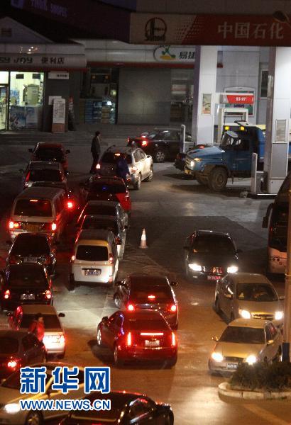 4月6日晚,武漢漢口的一個加油站擠滿前來加油的車輛。國家發(fā)展和改革委員會6日宣布,自7日零時起汽油、柴油零售最高限價每噸分別提高500元和400元,相當于90號汽油和0號柴油全國平均每升分別上漲0.37元和0.34元。部分車主選擇在油價上漲前來到加油站加油。新華社發(fā)