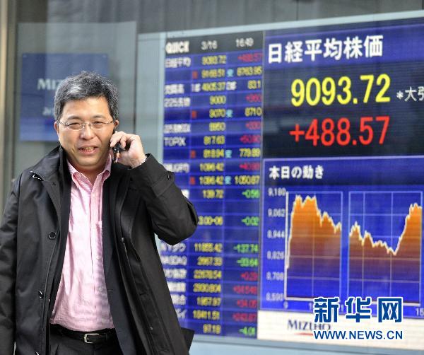 摘要: 3月16日,在日本東京,一名男子從股指行情顯示屏前走過。此前連續(xù)兩個(gè)交易日大幅下跌的東京股市日經(jīng)股指16日出現(xiàn)反彈,到收盤時(shí),股指上漲5.68%,重返9000點(diǎn)上方。 新華社/法新 新華網(wǎng)上海3月16日電