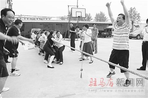 為加強(qiáng)文化建設(shè),豐富職工文化生活,近日,確山縣農(nóng)聯(lián)社舉辦了職工健身活動(dòng),近百名職工參加了拔河、乒乓球、羽毛球等比賽。圖為拔河比賽異常激烈。