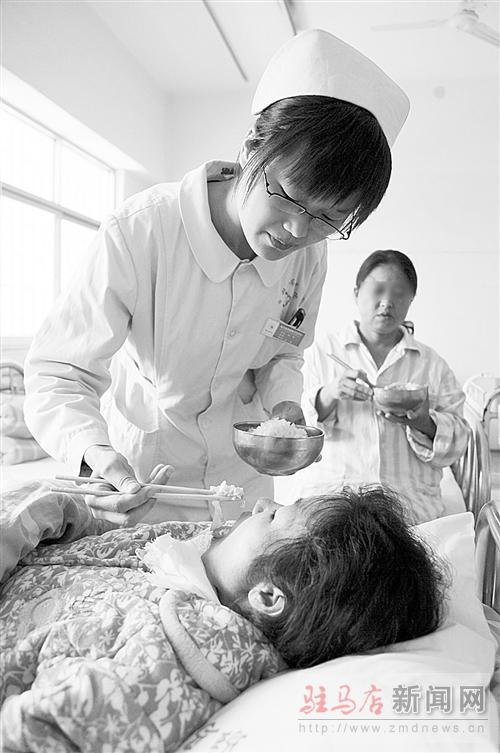 護士梁意在喂患者吃飯。