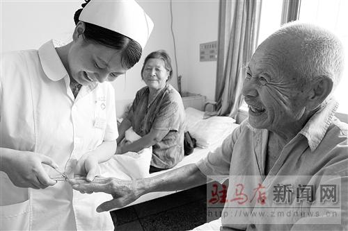 “護(hù)士長,俺在家也沒有過這待遇,你對俺真好!”昨日,在汝南縣第二人民醫(yī)院內(nèi)二科病房里,85歲的王進(jìn)廠老人高興地對前來給他剪指甲的該科護(hù)士長說。