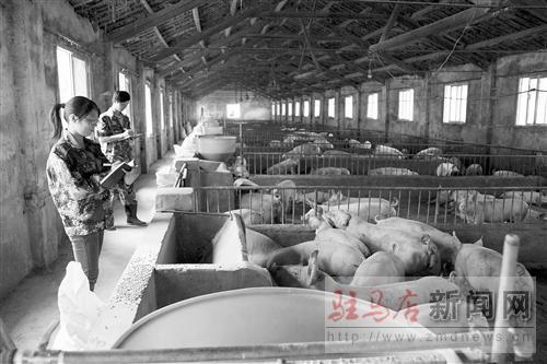 大學(xué)生在豬舍清點(diǎn)生豬數(shù)量。