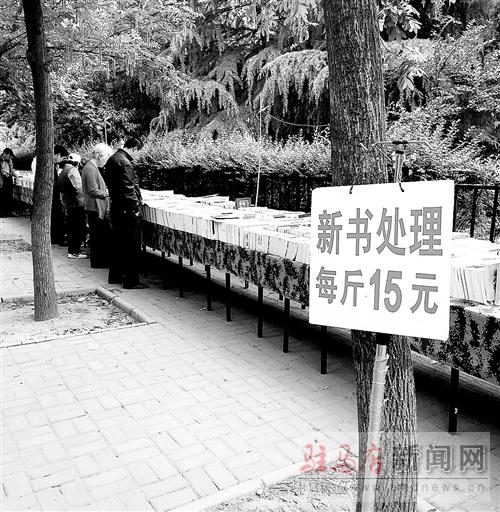 昨日上午,接到市民反映后,記者來到市健康路西段,看到路邊擺放了許多圖書,在書攤的兩頭,兩個“新書處理,每斤15元”的牌子非常醒目,一些市民正在書攤邊挑選。“我們都是從正規渠道進的貨。”賣書的商販說。