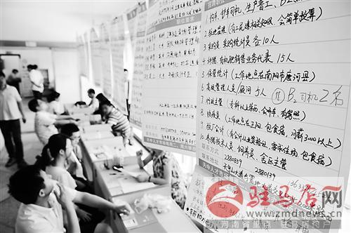 7月2日,在駐馬店市天中人才市場一樓招聘大廳,30多家企業提供了近400個崗位,600多名求職者前來應聘。記者看到,招聘企業大多來自市區,但是一些縣城的企業也在此“搶”人才。平輿縣一企業開出了“月薪3000元、管吃住”的條件。