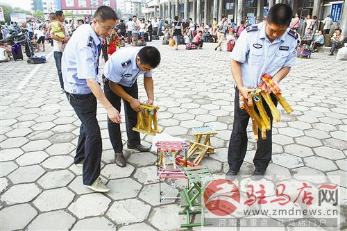 在駐馬店火車站廣場,記者看到幾名60多歲的婦女在賣小板凳,看到有乘客走來,她們就上前拉住乘客推銷小板凳,乘客表示很煩。當(dāng)日,工作人員沒收50多個小板凳,并對攤主進行了批評教育。記者 馬國省 攝