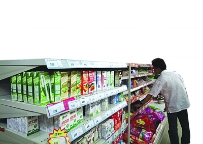 南京不少超市的貨架上,都擺滿了花花綠綠的牛奶。秦翼 攝