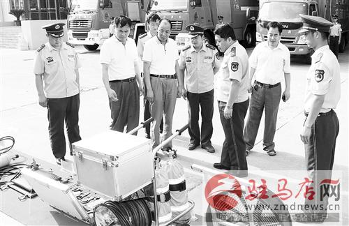 軍民魚水一家親,共建和諧雙擁城。八一建軍節即將來臨之際,開發區黨委、管委會領導班子有關成員看望慰問了駐馬店軍分區和該區公安消防大隊的官兵,分別為他們送去了節日慰問金3萬元和節日的祝福以及美好的祝愿。圖為慰問成員在該區公安消防大隊參觀新型消防設備。 記者 唐