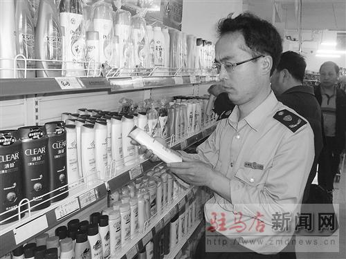 近日,確山縣工商局對日化用品進行了專項整治,嚴防假冒日化用品流入市場。圖為該局執法人員在一超市內檢查日化用品。 記者 張新義 通訊員 田 華 攝影報道