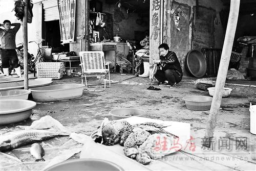 當日上午10時40分,記者在確山縣南山菜市場南側賣魚的區域看到一魚店門口的凳子上擺著一塊木板,木板上有幾只已經死去的野兔,對面的一家魚店門前則擺著幾只死野雞。魚店門口,一名男子正在聚精會神地剝一只野兔的皮(如圖)。看到記者拍照,正剝兔皮的魚店老板忙問:“你是干什么的?”記者回答:“林業局的。”其他幾家經營野雞、野兔的魚店老板聽到記者的回答,趕緊將擺在店前的野雞、野兔收了起來。