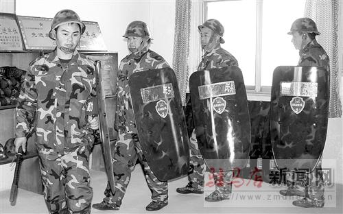 “雙節”將至,為了營造穩定和諧的治安環境,日前確山縣石滾河鎮武裝部投資3萬余元購買了防火、防暴設備,建起了120人的民兵應急大隊,下設10個中隊,負責處理鎮里的突發事件。圖為接到處置一起群體打架事件的命令后,隊員們全副武裝準備奔赴現場。 記者 張新義 通訊員 李 璞 段陽東 攝影報道