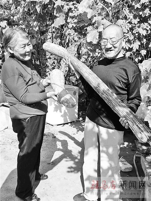 說起“超長南瓜王”,栗老漢一臉自豪。栗老漢告訴記者,南瓜是他今年4月種的,7月他就收獲一個1.1米長的南瓜,沒想到現在又收獲一個1.3米長的南瓜。