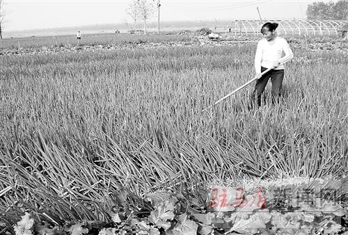 上蔡縣塔橋鎮李店村近500畝的蔬菜生產基地里生機盎然。該村群眾家家都以種菜為業,成為遠近聞名的小康村。菜農李玉丹告訴筆者,她家的3畝菜地春夏栽的是番茄,收入1.8萬元;秋冬種的是大蔥,按照時價算,可收入1.5萬元。圖為李玉丹正在田間侍弄長勢良好的大蔥。     記者 通訊員 席建新 攝影報道