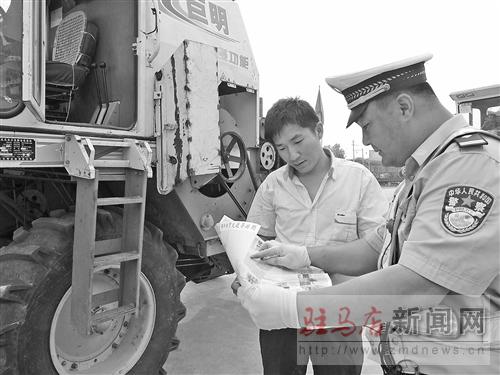 三夏期間,為確保過往聯合收割機順利過境,西平縣農機部門和交警部門聯合在107等主要交通干道設立了跨區機收接待服務站,為機手供應茶水、維修、指引路線、提供作業信息、安排作業地點等服務,使他們來得安心、作業放心、去時開心。至目前,該縣跨區機收接待服務站已接待聯合收割機100多臺、機手250多人次,幫助檢修機車10余臺。圖為107巡邏中隊交警正在為跨區作業機手提供指引路線服務時的情景。 記者 丁 振 通訊員 牛齊瑞 攝影報道