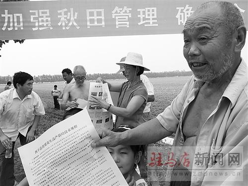 “有了科技明白紙,以后秋管再也不用發愁了!”7月7日,拿著農業部門發放的秋田管理科技明白紙,西平縣重渠鄉的老農開心地笑了。為了加強秋田管理,該縣農業部門通過調查研究,將農民在秋田管理工作中遇到的疑難問題編寫成明白紙發放到農民手中,并派農業專家現場予以指導。目前,該縣已發放科技明白紙近萬份,受到了廣大農民的歡迎。 記者 丁 振 通訊員 胡軍華 攝影報道