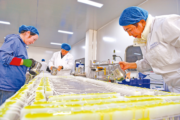 12月16日,在河南杞樂生物科技有限公司車間內,旗下品牌“夢莉嬌”精油手工皂正在生產線上火熱趕制。“公司從事大馬士革玫瑰的提純研發和生產加工,已推出手工皂、玫瑰純露、精油等50多種產品,年產玫瑰手工皂600萬塊以上。”該公司行政負責人曹戰林介紹。