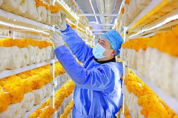 12月16日,山東省棗莊市市中區(qū)農(nóng)民在“智慧菇房”管護(hù)食用菌菇。