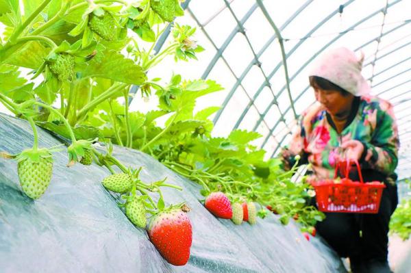 12月16日,農(nóng)民在山東省濱州市博興縣湖濱鎮(zhèn)柳童村大棚里采摘草莓。